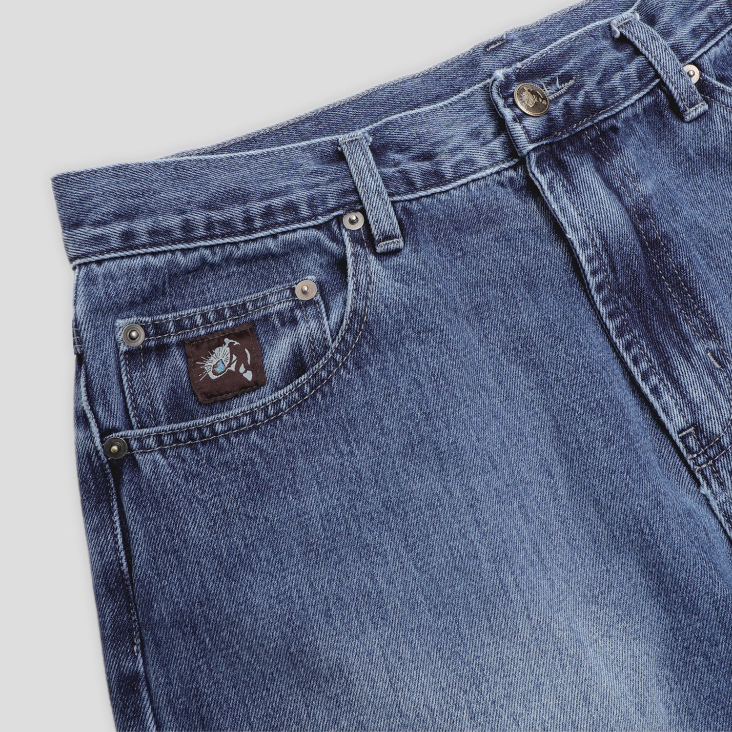 Australian Made Denim Jean from the Pass~Port Australian Manufactured Range #3. The Pass~Port pant is made from a 12 oz cotton denim featuring silver triple stitching for extra strength with a faded washed dark indigo. The Pass~Port jeans have back pocket tilde detailing, woven label on coin pocket with silver rivets & custom silver button.
