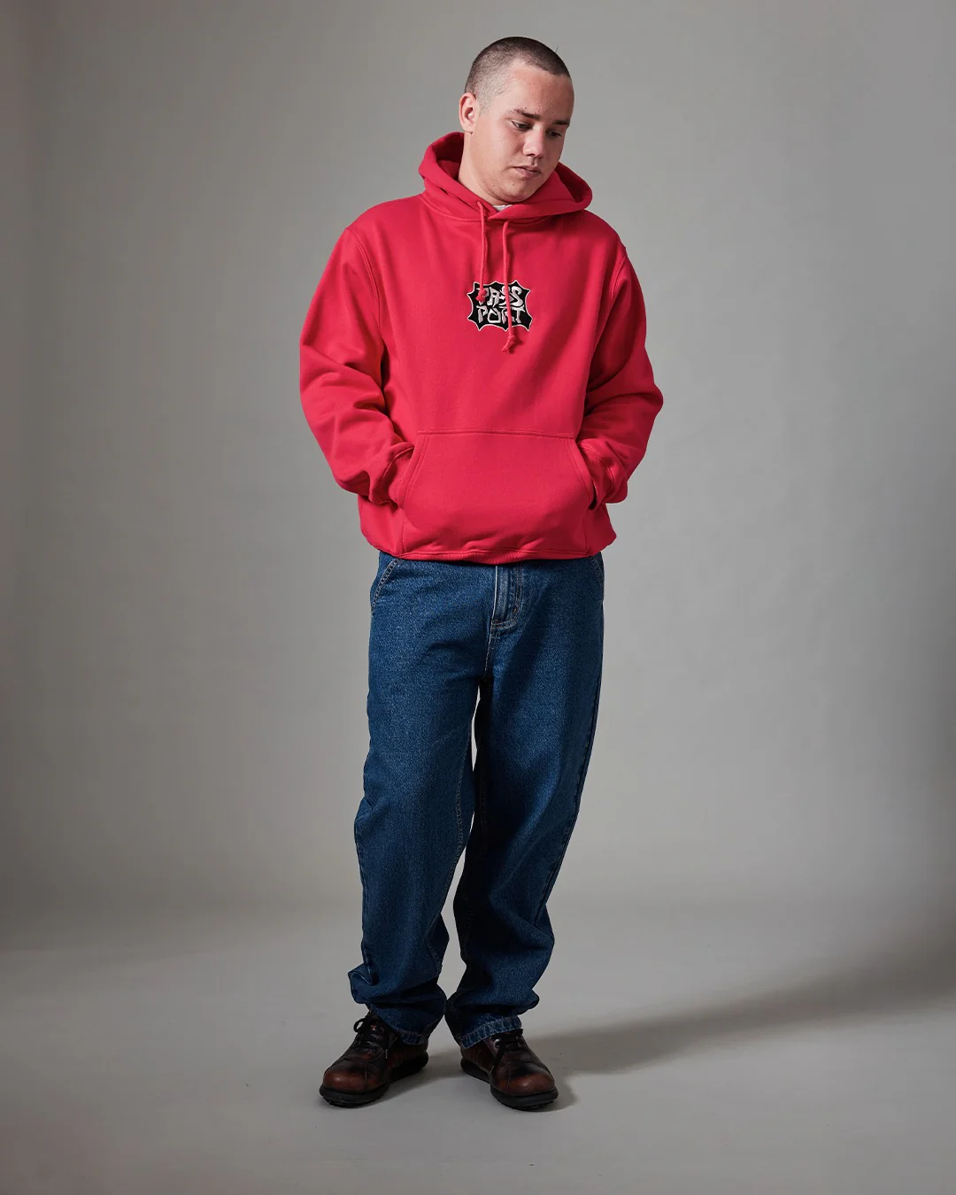 Pass~Port Glyph Hoodie in red is part of range #45. The Pass~Port hood is made from a polyester / cotton blend and features direct embroidery on front, which is finished in the classic Pass~Port hoodie fit.