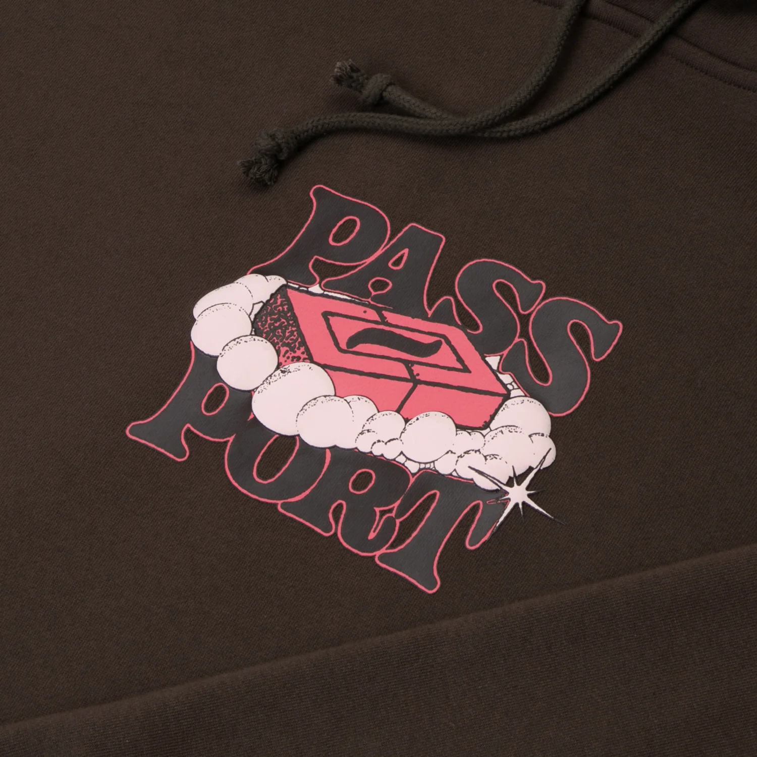 Pass~Port Soap hood in bark from range #45. Screen print puff print on the front and finishing in the classic Pass~Port hoodie fit. Polyester / Cotton blend.Â