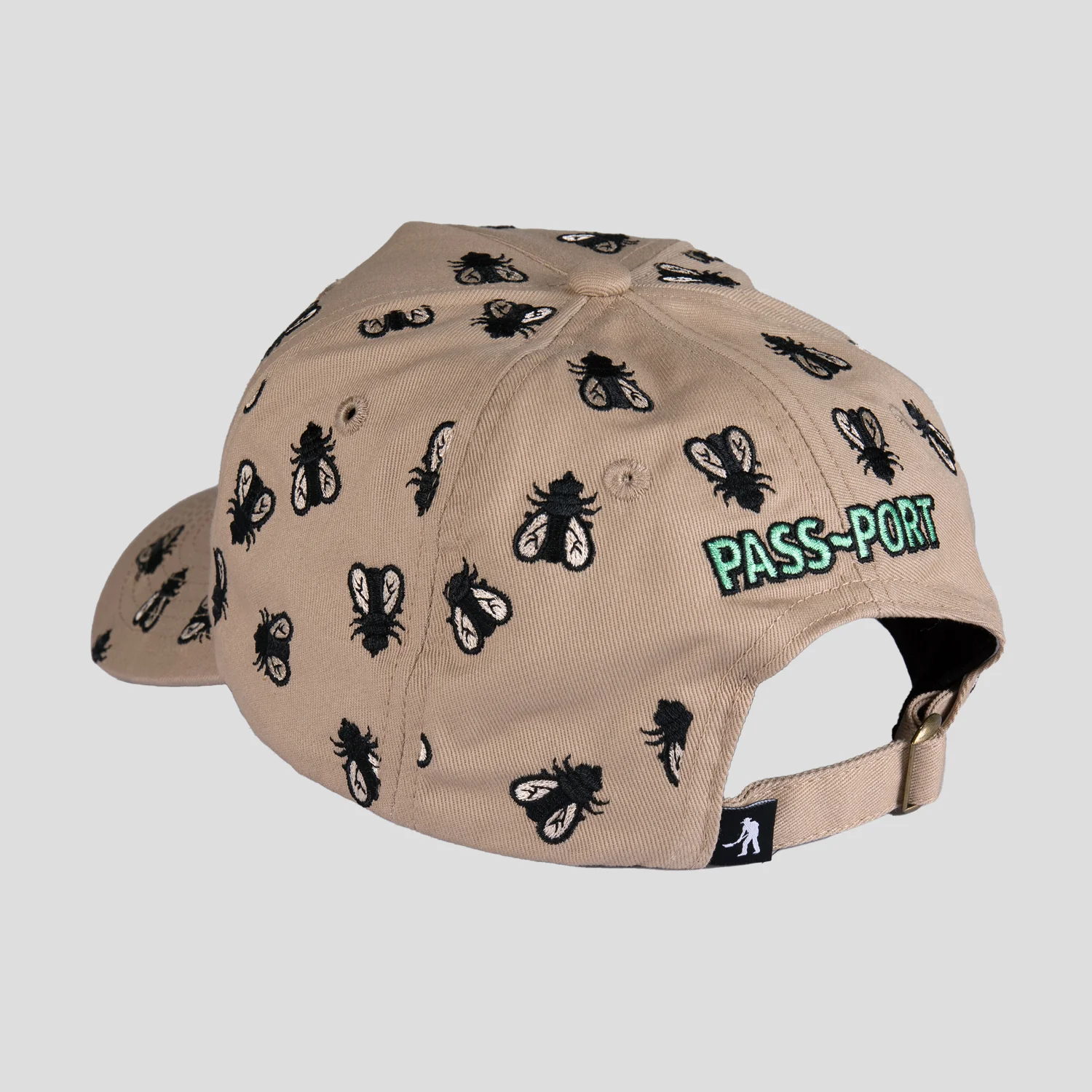 Pass~Port Wot Flies Packers cap in khaki from range #42. The Pass~Port hat is a 5 panel construction made from 100% cotton and features all over direct embroidery with with brass clasp adjustment.