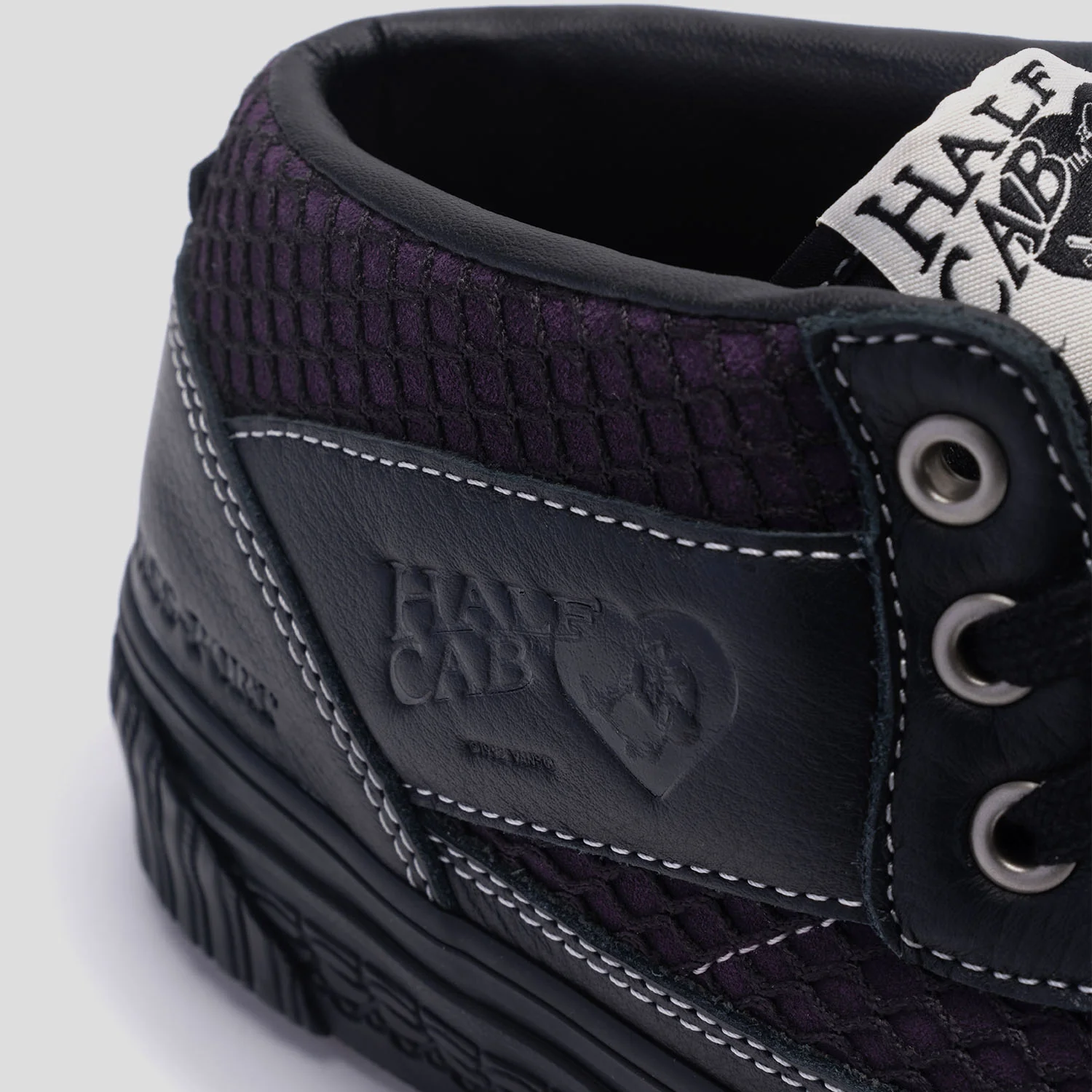 Pass~Port gives a nod to Oxford Street’s gritty and luxurious elements with this latest collaboration. Soft fishnet lace overlaying a dark purple suede contrasts with tough leather and metal eyelets, creating a Skate Half Cab that on closer inspection have more to offer than their hard exterior. Contrast stitching, lace embossed foxing, fishnet printed footbeds and ribbed caps reference the scenes that define Sydney's nightlife. Completed with Pass~Port and Vans branding which takes the form of subtle glossed embossing and woven labels reminiscent of gritty calling cards and photocopied gig flyers.